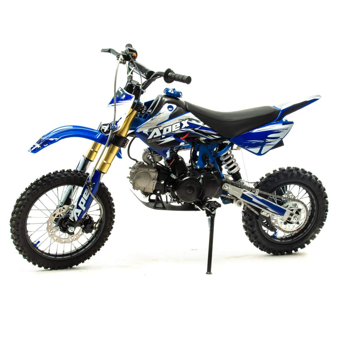 Недорогой надёжный питбайк APEX10 идеален для поездок по грунтовым дорогам и бездорожью для детей которые уже научились ездить на маленьких мотоциклах объемом 50 куб.см. Хорошо чувствует себя на мягком и среднем грунте.